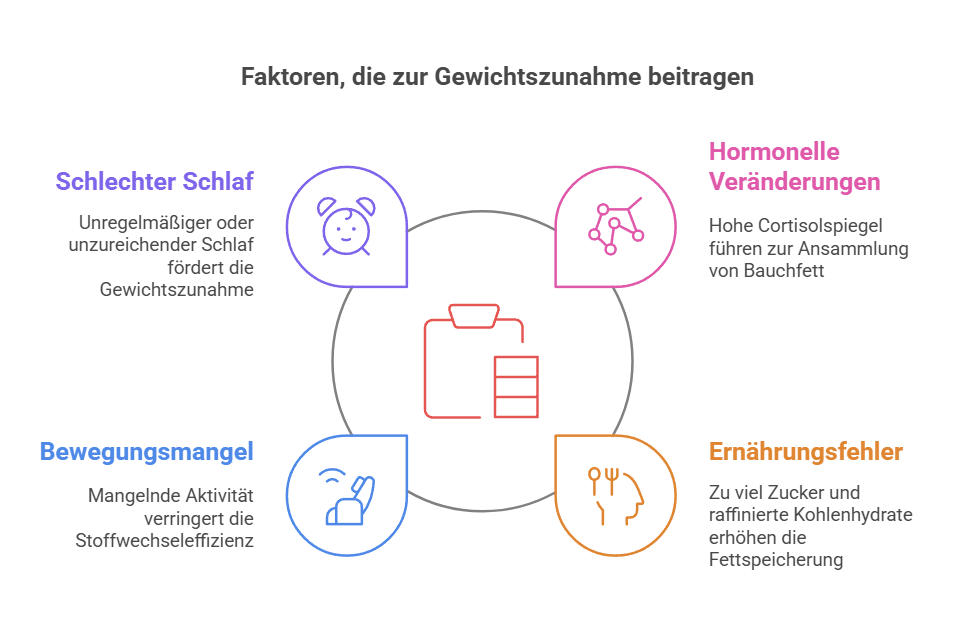 - Hormonelle Veränderungen: Hohe Cortisolwerte begünstigen die Ansammlung von Bauchfett.