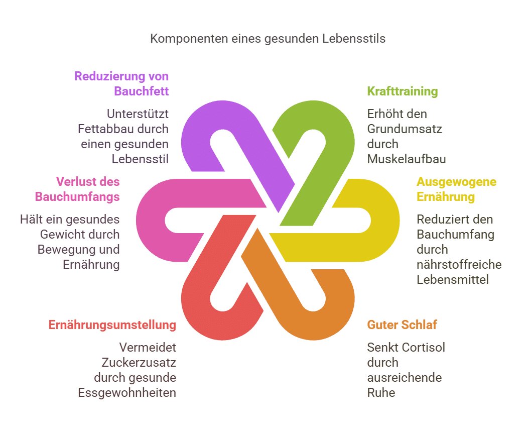 - Schlaf: Weniger als 6–7 Stunden erhöht das Stresshormon Cortisol, welches Bauchfett begünstigen kann.