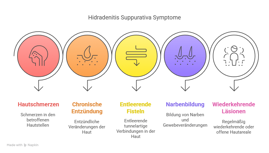 Die Diagnose von Akne inversa ist oft schwierig, da sich die Symptome schleichend entwickeln. Akne inversa beginnt meist mit kleinen Knoten oder Rötungen an bestimmten Körperstellen, die mit der Zeit schmerzhaft, nässend oder eitrig werden. Später entstehen Fistelgänge, Abszesse mit Fistelgängen und Narbenbildung und teils großflächige Schädigungen der Haut.