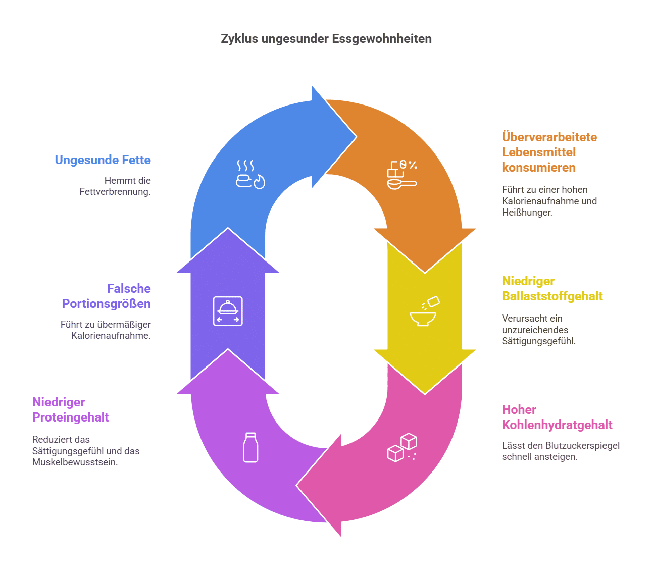 - Zu viele verarbeitete Lebensmittel: Fast Food und stark gesüsste Produkte enthalten oft viele Kalorien und fördern Heißhunger.