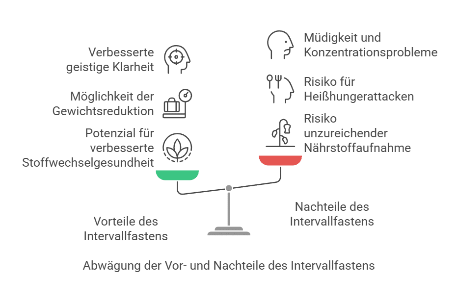 Intervallfasten ist nicht für jeden die beste Wahl. Menschen mit Essstörungen, starkem Untergewicht oder hormonellen Problemen sollten sich vorab ärztlich beraten lassen. Frauen reagieren möglicherweise empfindlicher auf längere Fastenperioden, da diese den Hormonhaushalt beeinflussen können.