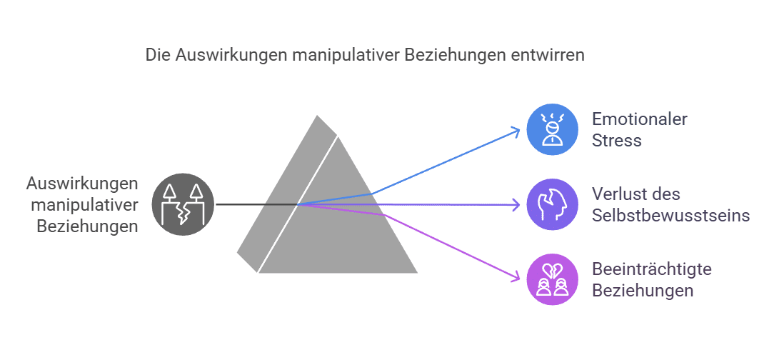 Der Artikel nennt bereits emotionale Stresssymptome, Verlust des Selbstwertgefühls und Isolation. Zusätzlich zeigen Forschungsarbeiten, dass manipulative Persönlichkeitsmerkmale – insbesondere aus der Dunklen Triade, mit langfristigen psychischen Belastungen und problematischen zwischenmenschlichen Beziehungen einhergehen. Ohne Gegenmaßnahmen kann sich das Muster verfestigen, Opfer fühlen sich zunehmend ohnmächtig, haben Probleme, anderen zu vertrauen, und geraten oft in einen Kreislauf von Selbstzweifeln und Abhängigkeit. Professionelle Hilfe sollte ernsthaft in Erwägung gezogen werden.