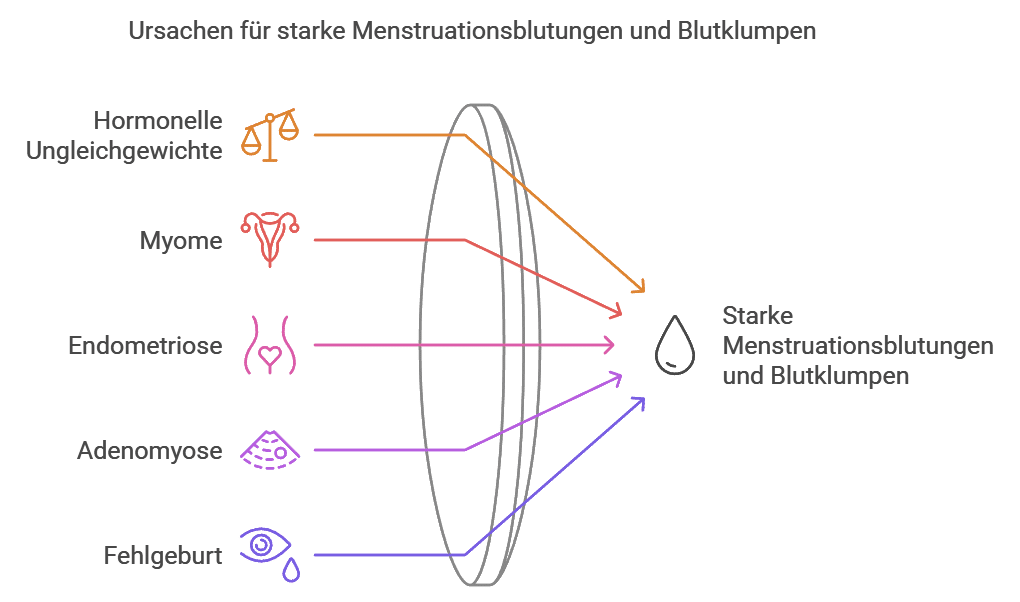 Mögliche Ursachen bei wiederkehrender Auffälligkeit Hinter anhaltend starken Blutungen mit Klumpen können unter anderem Myome, Polypen, Endometriose, Adenomyose oder hormonelle Störungen stehen.
