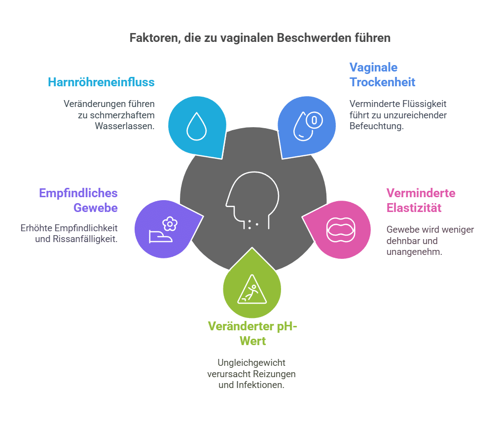 Der Hauptgrund für diese Veränderungen ist der Östrogenmangel, der zu einer verringerten Feuchtigkeit in der Scheide führt. Dadurch wird das Gewebe der Vulva und der Scheide beim Geschlechtsverkehr nicht ausreichend mit Feuchtigkeit versorgt, wodurch Schmerzen und Reizungen entstehen. Zudem kann das Eindringen des Penis unangenehm oder sogar schmerzhaft sein.