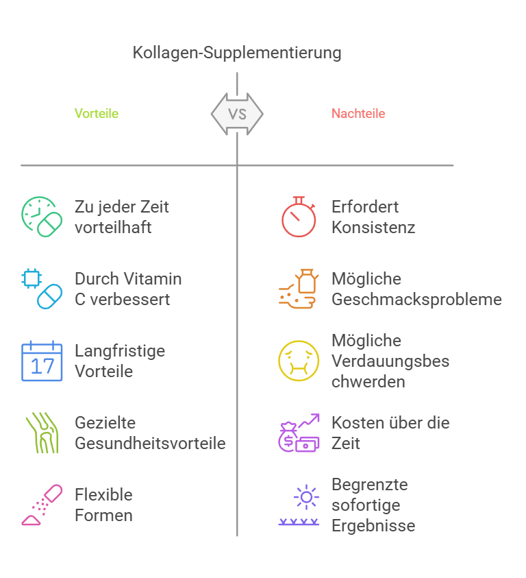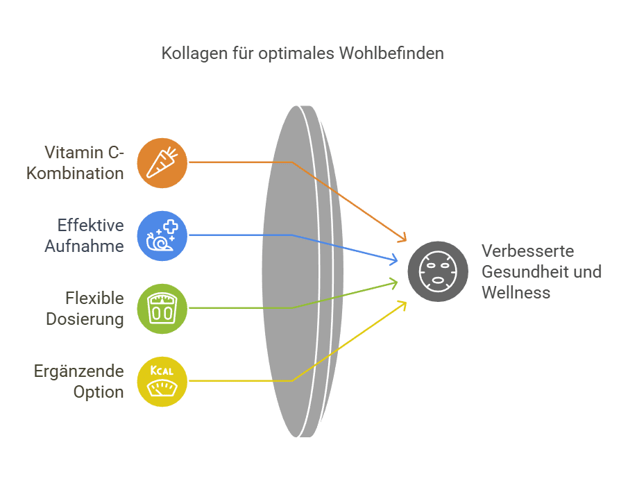 Zusätzlich können Nahrungsergänzungsmittel wie Collagen-Pulver oder Kapseln eine wertvolle Unterstützung darstellen, insbesondere bei einer Ernährung, die wenig natürliche Kollagenquellen umfasst.
